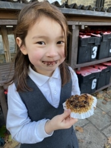 YYear 2 pupils smiling and enjoying the muffins they baked together.