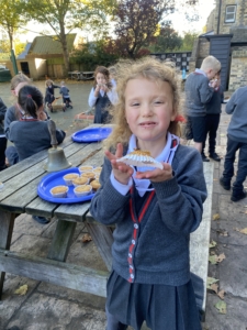 Year 2 pupils smiling and enjoying the muffins they baked together.