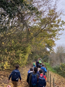 ear 5 pupils walking along a woodland path during their autumn ramble.