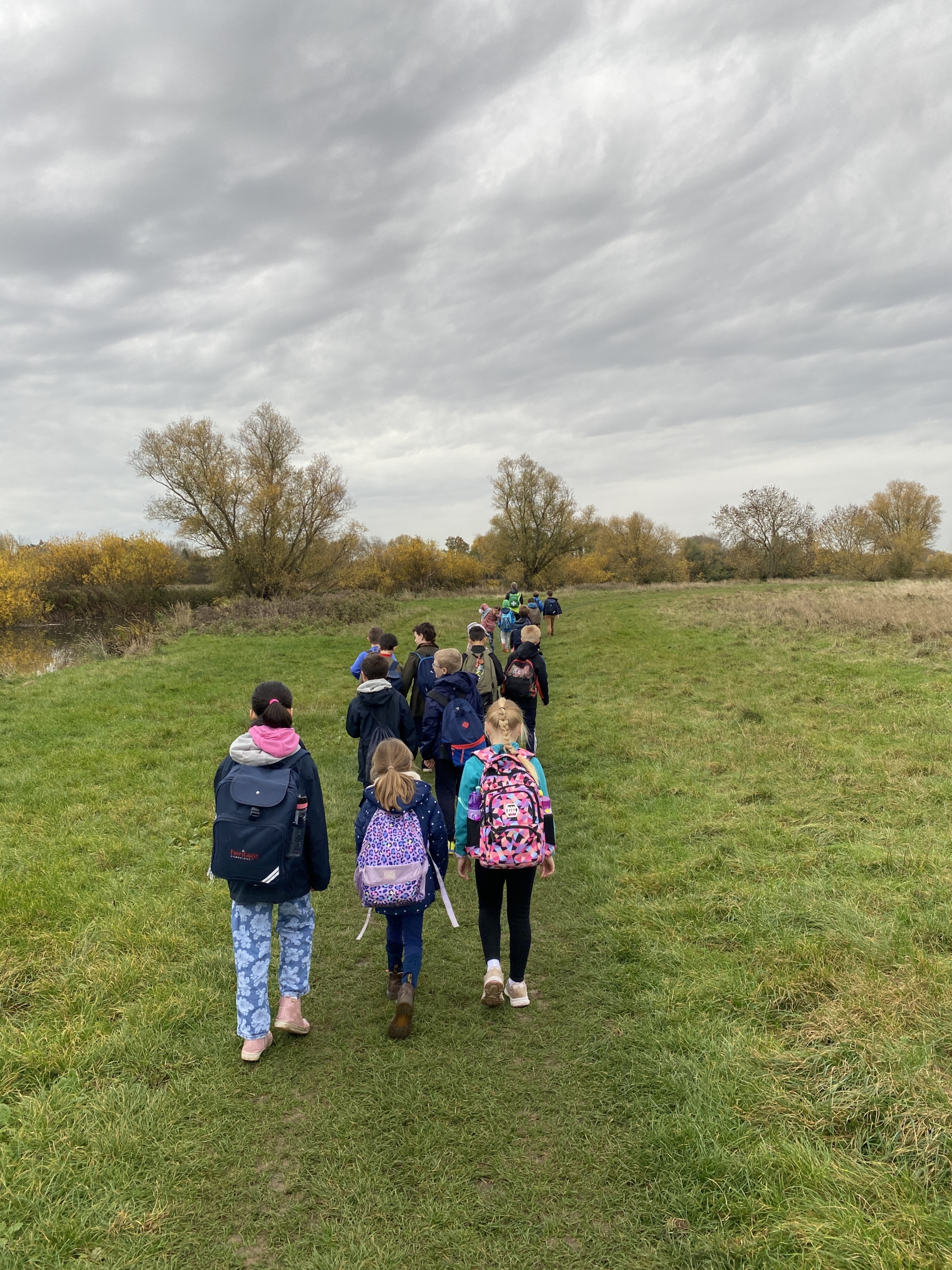 ear 5 pupils walking across a field during their autumn ramble.